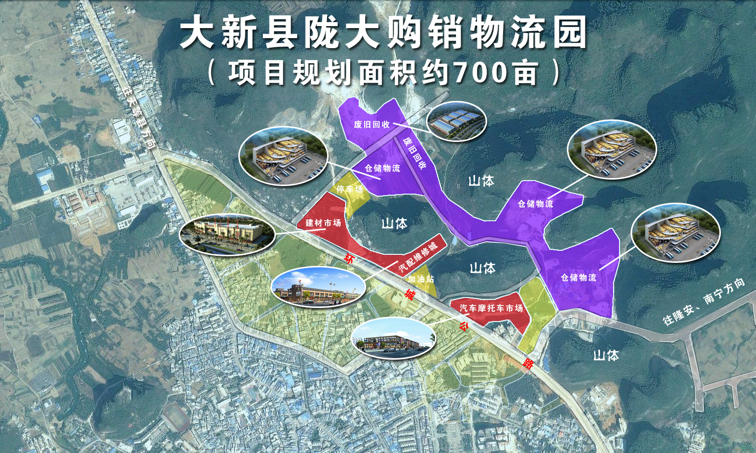 项目主要建设建材销售市场,汽车、摩托车销售与维修市场,废旧物资回收市场,快递物流、仓储物流、冷链冻库市场等大型多功能购销物流基地,是规范大新县城镇化发展的功能性基础园区。