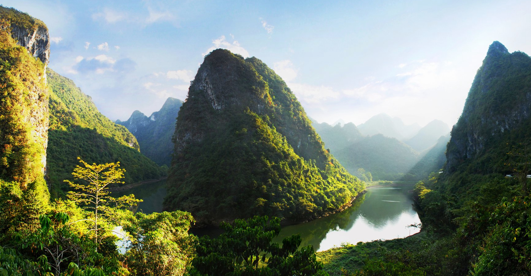黑水河风景区位于大新县那岭乡约屯,距县城35公里,属岩溶峰丛峡谷景观自然风景区。黑水河在历史上茂林竹丛,河水清而深呈蓝色,故名黑水河。黑水河在大新县境内长45.5公里,属左江支流。黑水河以峰丛体量之雄、峡谷之险、河弯之幽、洞穴之奥为特色。主要有三个景点。那岸奇景:长约9公里,属岩溶峰林谷地地貌。两岸群山如削,奇石环列,水清景异。月亮山、刀刃峰、仙人指、罗汉峰、老人山等奇峰怪石层出不穷。那岸电站飞水成瀑,是典型的峡谷水库类型,很是壮观。黑水河田园风光:长约20公里。两岸树木葱郁,水至清,多跌水,沿河是玲珑的石岸,岸边的稻田、竹丛、果树、农舍掩映,俨然如桃源仙境。那榜田园风光:那里河水蜿蜒,水面如镜,倒影远方两座单斜山峰,岸边田园平铺。田间小路、果林、农舍似锦似画,妙不可言。